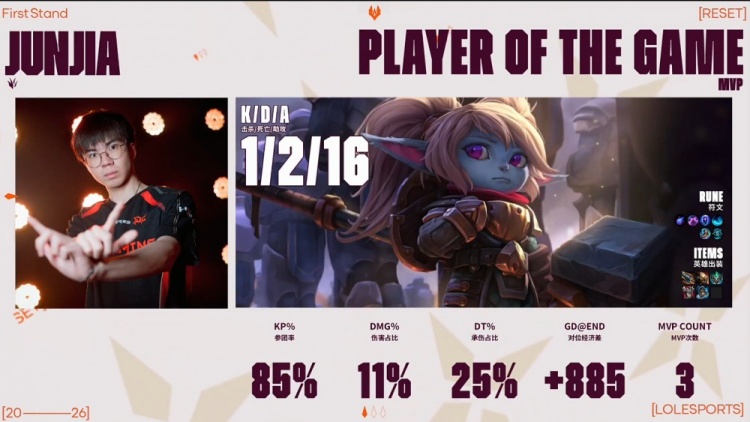 直播吧3月21日讯 2026年全球先锋赛来到小组赛第四日,最终LPL二号种子JDG3-1淘汰LCS一号种子LYON!