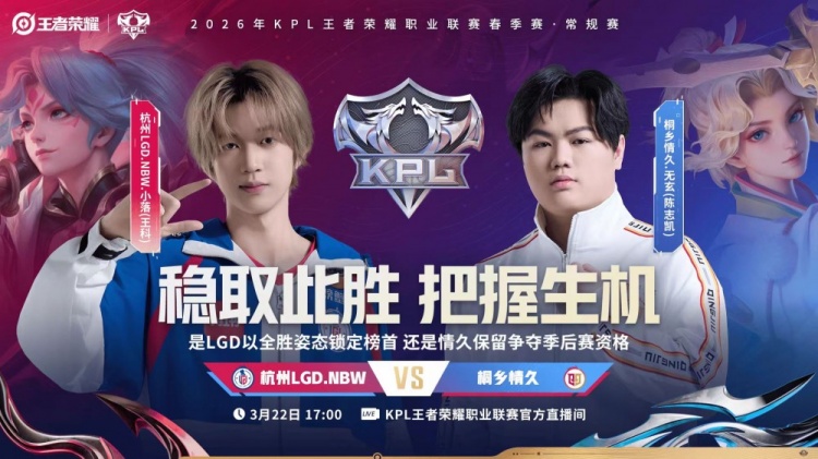 直播吧3月22日讯 2026KPL春季赛本场比赛是由杭州LGD.NBW对阵到桐乡情久!