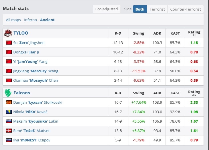 图二是Falcons的选图Ancient,上半场TeSeS手枪局串烧双杀,随后指挥Kyxsan先是残血直架Jee赢下1v2残局,随后4杀配合Niko打出2v5,下一回合虽然Zero开局三杀但是NiKo同样三杀还以颜色!Falcons上半场持续拿分,打出一波11-1进攻高潮。下半场Kyxsan手枪局USP一发秒掉Jee赢下1v1残局之后TYLOO彻底没了机会,最终Falcons以13-1暴打TYLOO还以颜色,将比赛拖入了决胜图Mirage!