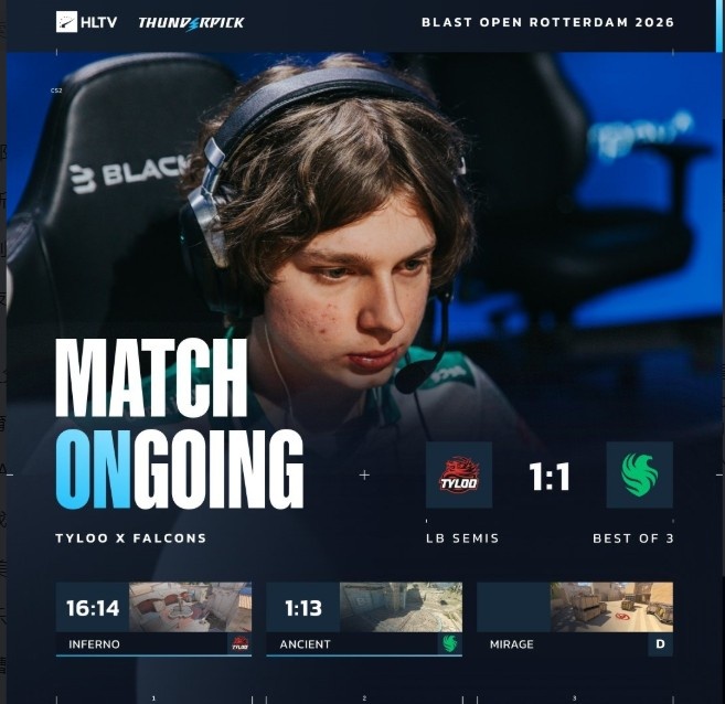 直播吧3月22日讯 Blast鹿特丹公开赛今天继续进行,小组赛的败者组半决赛中国战队TYLOO将要对阵Falcons!