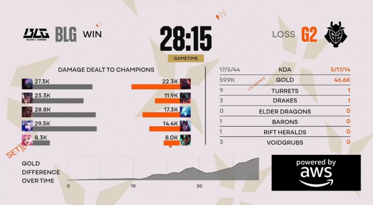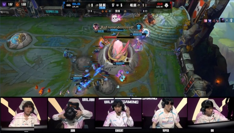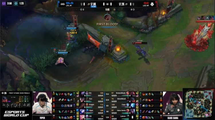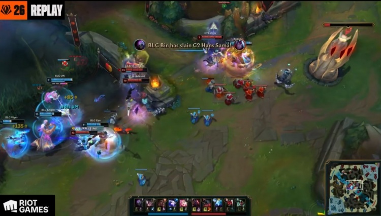 【17:28】中路团战,Bin贾克斯TP落地直接打Caps冰鸟变蛋,Viper艾希射掉Caps,knight再杀BB,BLG打出0换3,推掉G2中路一塔,经济领先6k。
