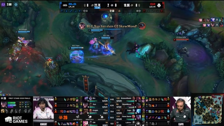 【12:57】河道2v2,Xun赵信配合Viper艾希一箭击中Labrov卡尔玛,Viper拿到人头,Xun带队出击再捅飞SkewMond剑魔,BLG打出0换2,经济领先3.4k。