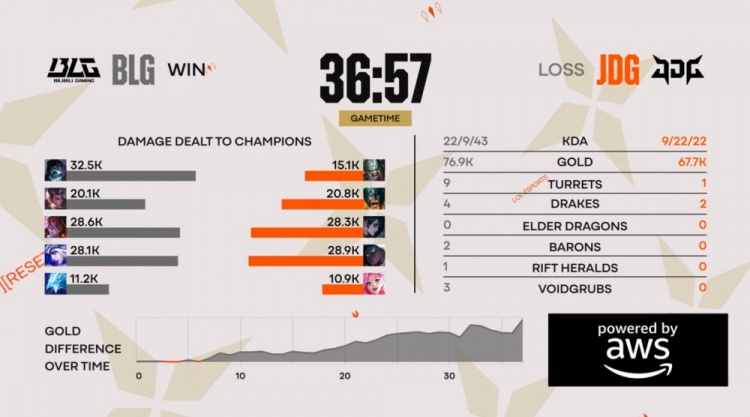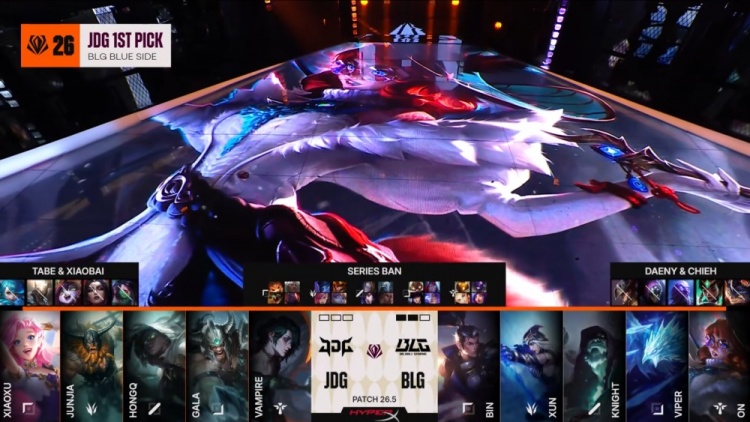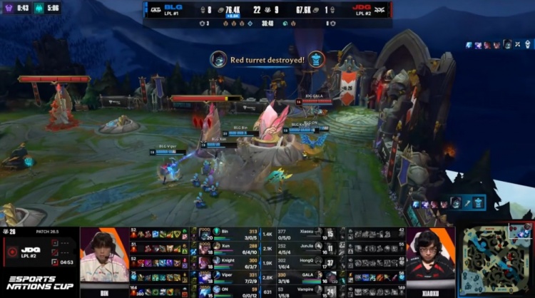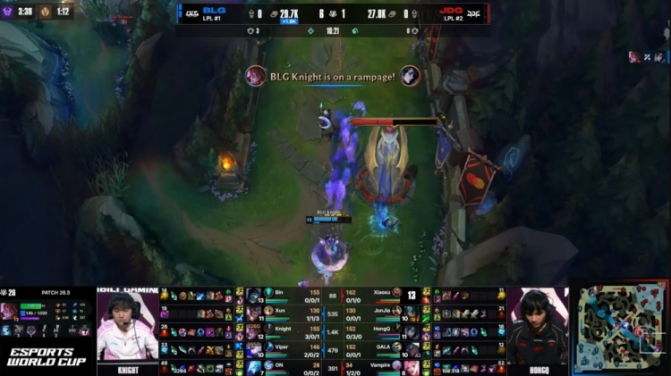 紧接着Viper艾希一箭再射中HongQ,knight阿萝拉想要杀人但被GALA配合队友将其反杀,JDG拿到小龙,双方大龙开战,Junjia强行砍掉Viper被换,徐神蛮王TP下来进BLG众人之间被杀,BLG打出1换4吃掉大龙,经济领先7k。