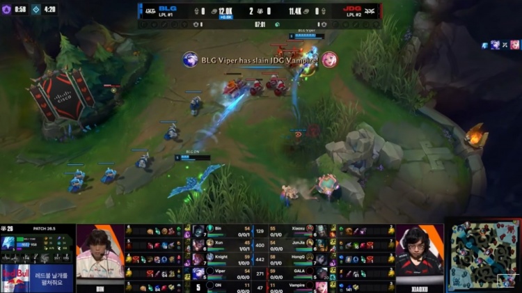 【25:06】BLG下路推进,knight阿萝拉被JDG众人集火击杀,但Viper艾希反手射掉Junjia奥拉夫,双方打出1换1。