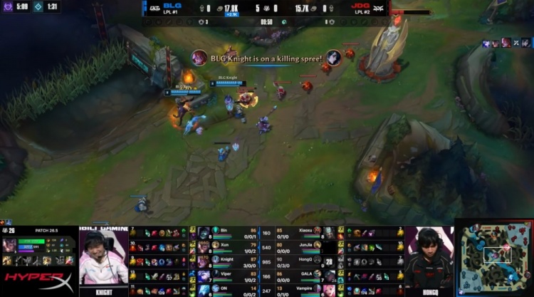 【32:48】BLG中路推进,knight阿萝拉高地塔前被JDG三人集火秒杀,双方拉开。
