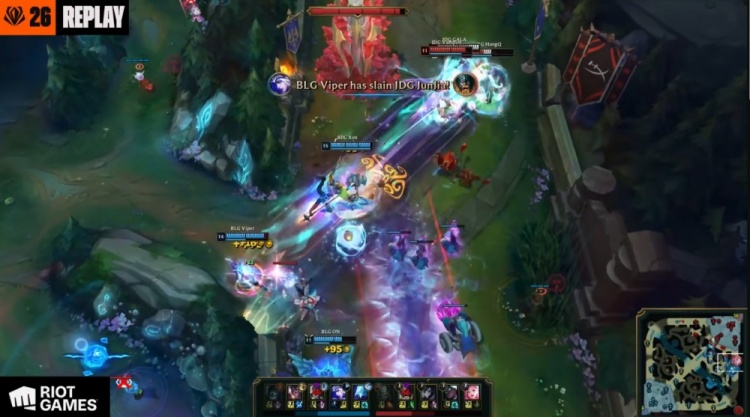 后期BLG打出1换3轻松拿到大龙,龙魂团双方1换1,Junjia强行砍掉Viper但自己被换,徐神蛮王毫无作用,BLG打出1换4再吃大龙,经济领先7k。