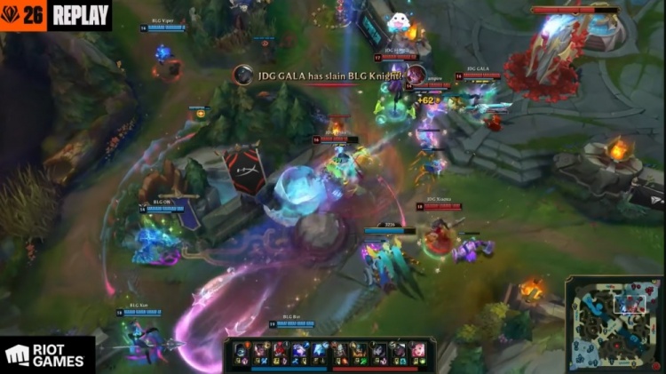 【20:48】上路Viper艾希一箭打出HongQ闪现,BLG中路放出先锋撞掉JDG二塔,Xun赵信捅飞Junjia奥拉夫,HongQ送Xun双杀,GALA终于点掉Xun,BLG打出1换2。