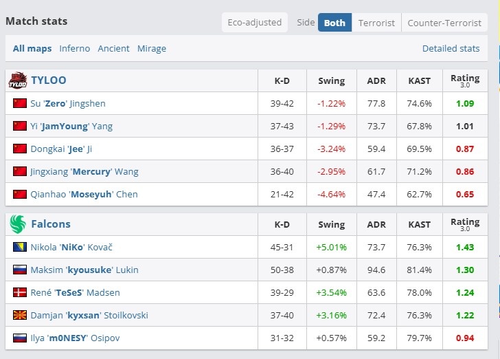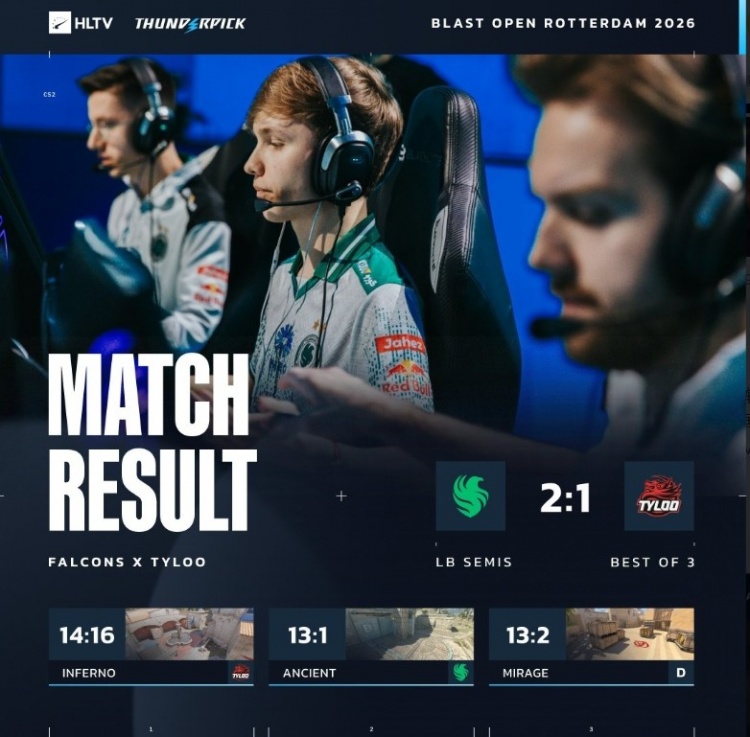 决胜图Mirage中TYLOO拼刀赢下之后CT方开局,但是手枪局被Falcons回防一波0换3之后直接陷入劣势,Jee更是一度以0-6战绩开局。而Falcons继续火力全开,无论是kyousuke还是NiKo都延续了图二的良好状态,Niko更是在A1卡神位扫转双杀赢下1v2残局,TYLOO半场再度以1-11大比分落后。下半场kyousuke手枪局中路usp开转4杀先拿11个赛点,虽然TYLOO钢枪翻盘挽救一个赛点但无力回天,最终TYLOO以2-13输掉图三,后两图被Falcons打出26-3的小局分,惨败出局!