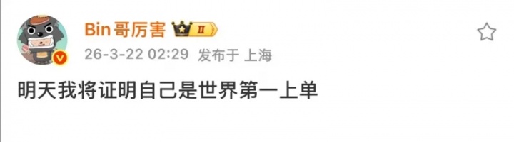 直播吧3月23日讯 在昨日的先锋赛上,BLG击败JDG晋级决赛,赛后Bin曾在微博上发言称将在决赛日上证明自己是世界第一上单。