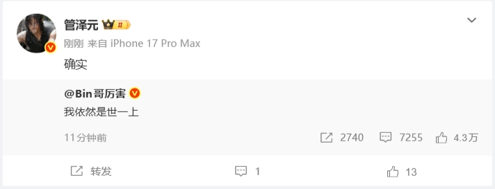 >管泽元评论转发Bin世一上微博:“确实”