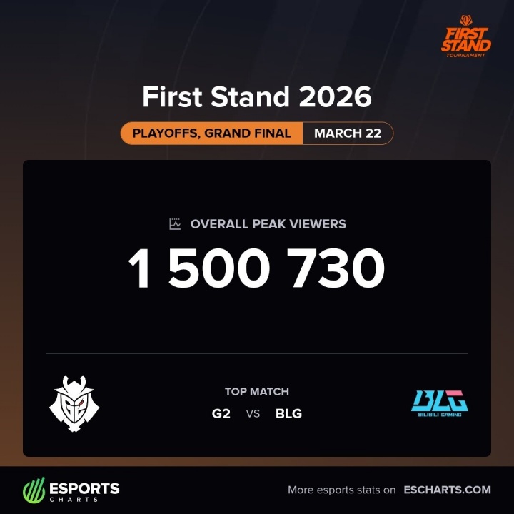 直播吧03月23日讯 来自EsportsCharts的数据显示,BLG与G2的全球先锋赛总决赛峰值观众超过150w,较去年决赛HLEvsKC有着显著上涨。