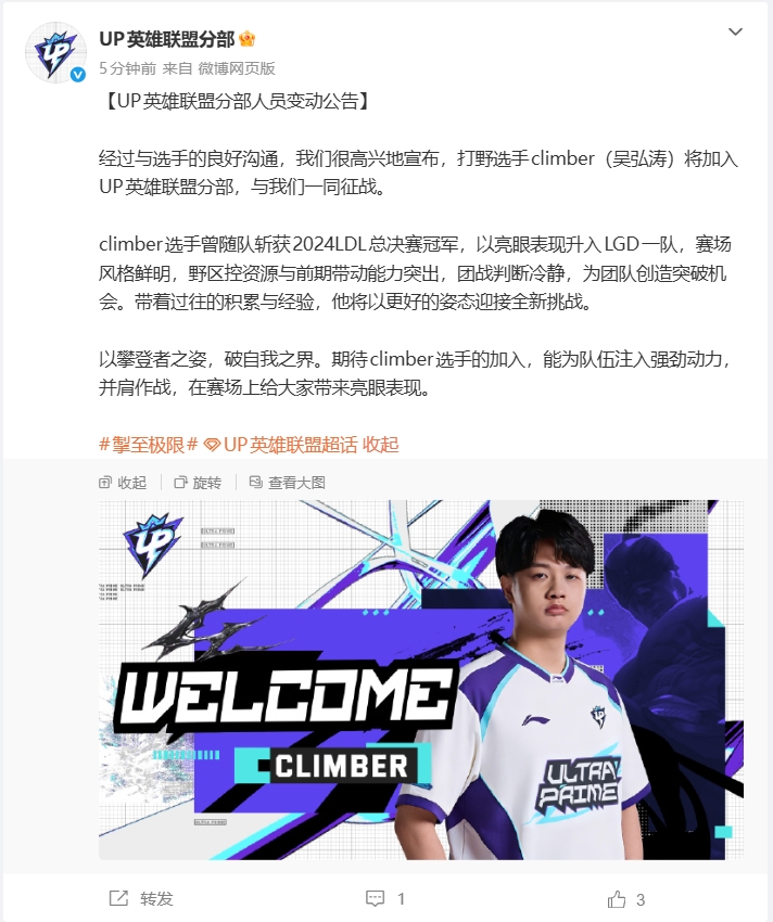 直播吧03月23日讯 来自UP俱乐部今天的第二条官宣,前LGD打野Climber以自由人身份加盟,将顶替韩援打野Grizzly离队后的空缺。