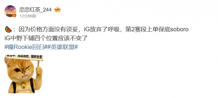 直播吧3月23日讯 刚刚爆料人“恋恋红茶”更博透露:因为价格方面没有谈妥,iG放弃了呼吸,第2赛段上单保底soboro!iG中野下辅四个位置应该不变了。
