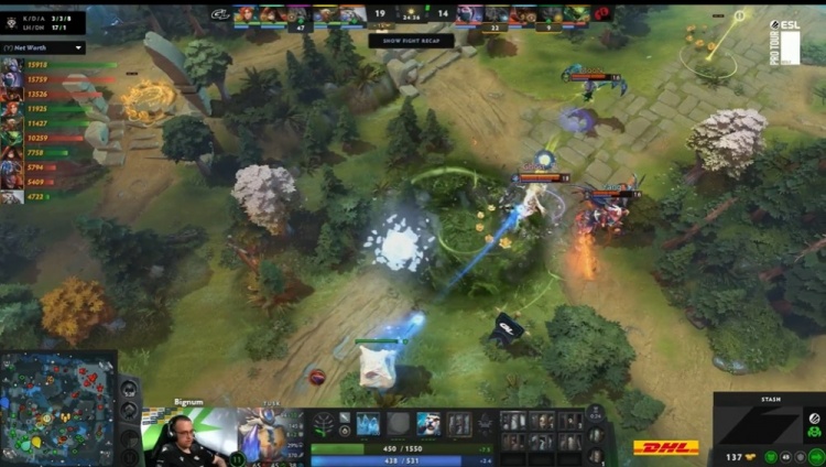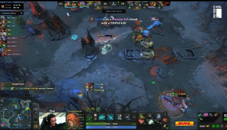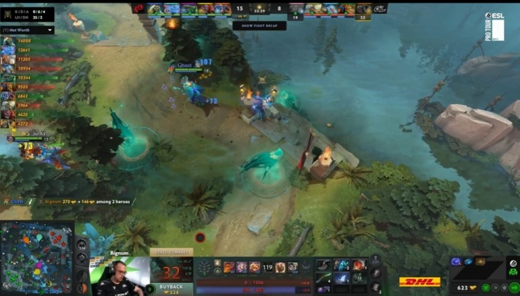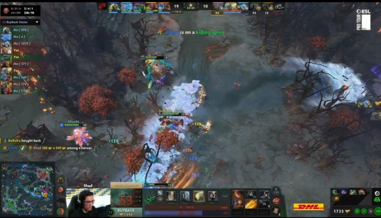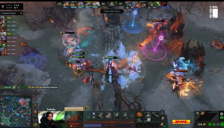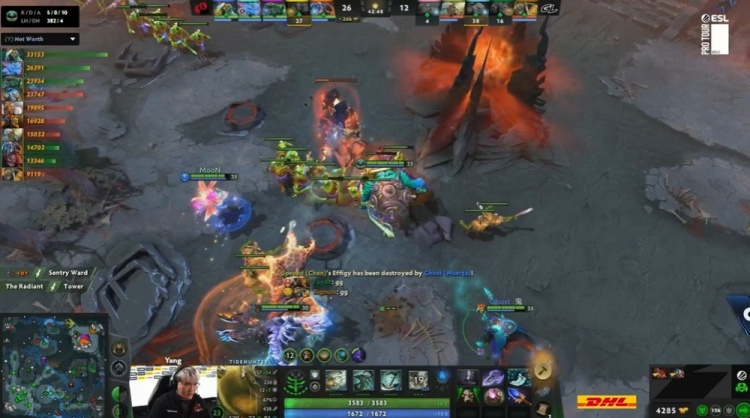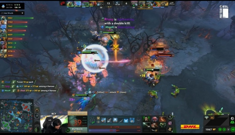 YB带盾刷钱,将经济优势扩大到7K。20分钟,fayde蝙蝠大招拉走落单Ghost琼英碧灵,琼英碧灵被围杀。22分钟,Moon帕克和天命双头龙配合,将全能冻住击杀,另一边Ghost琼英碧灵也和boboka莱恩配合带走暗影萨满,正面团站YB拥有较大优势,但落单容易被击破。