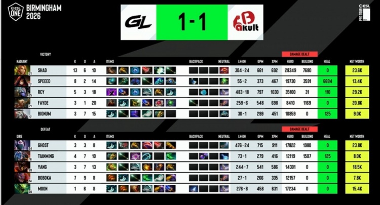 36分钟,GL带盾杀上高地,YB技能全交搞不死修补匠,四人阵亡高地被拆后,YB打出GG,双方以1-1握手言和。