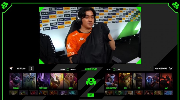 最终abed凯尔中路轰掉哥哥影魔,哥哥没买活,只能眼看VP冲上自家高地,abed再拿双杀,XG敲出GG,双方战成1-1平。