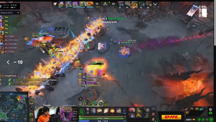 后期VP中路推进再次尝试上高,Timado见面秒掉xNova,abed凯尔三颗陨石落下,XG双酱油率先阵亡,X哥刃甲bkb全开保住一命,VP推掉XG三路兵营,XG背水一战,X哥刃甲弹死VP两人,双方打出3换3,VP暂且撤退。