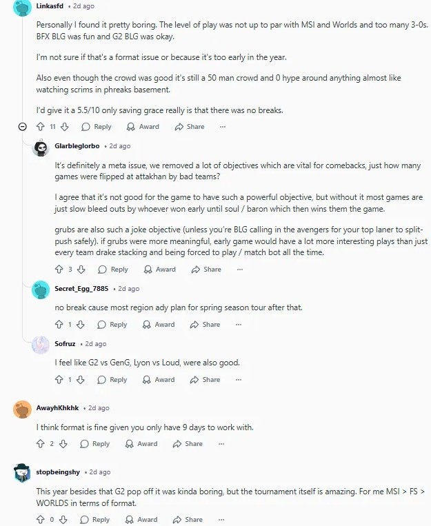 就我个人而言,我觉得相当无聊。比赛水平没有达到MSI和世界赛的标准,而且出现了太多3-0的零封。BFX对阵BLG的比赛很有趣,G2对阵BLG的比赛还可以。