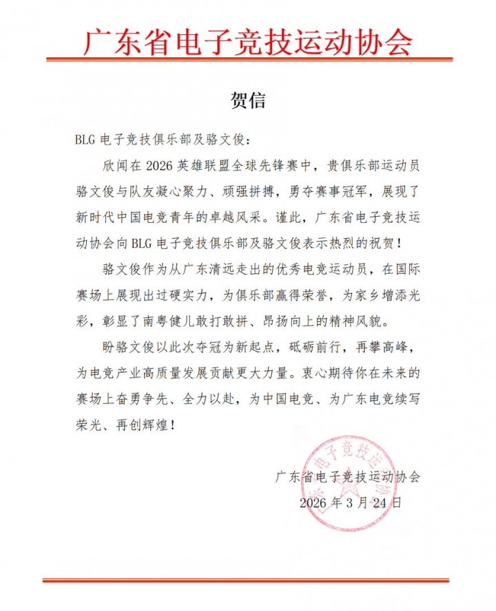 欣闻在2026英雄联盟全球先锋赛中,贵俱乐部运动员骆文俊与队友凝心聚力、顽强拼搏,勇夺赛事冠军,展现了新时代中国电竞青年的卓越风采。谨此,广东省电子竞技运动协会向BLG电子竞技俱乐部及骆文俊表示热烈的祝贺!骆文俊作为从广东清远走出的优秀电竞运动员,在国际赛场上展现出过硬实力,为俱乐部赢得荣誉,为家乡增添光彩,彰显了南粤健儿敢打敢拼、昂扬向上的精神风貌。盼骆文俊以此次夺冠为新起点,砥砺前行,再攀高峰,为电竞产业高质量发展贡献更大力量。衷心期待你在未来的赛场上奋勇争先、全力以赴,为中国电竞、为广东电竞续写荣光、再创辉煌!