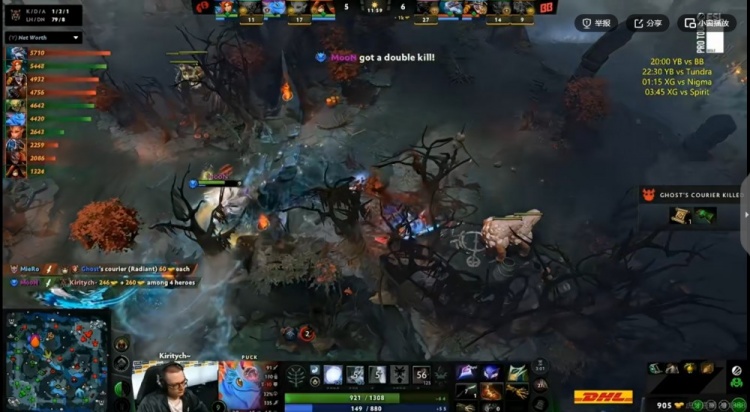 中期gpk帕克+MieRo兽王开始发力扫图,20分钟BB在上路找到机会前后夹击,强杀Ghost玛西之后打出0换3,顺势拿下魔晶!拉开经济差到7K了!23分钟BB拿下一代肉山,kiritych凯带盾!