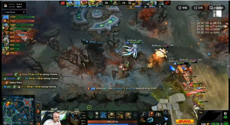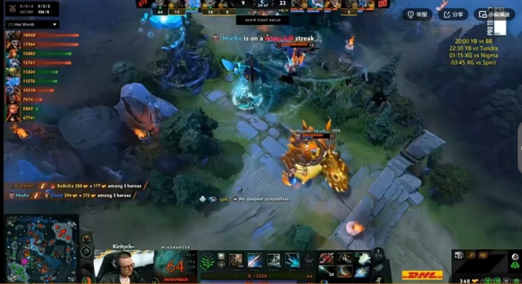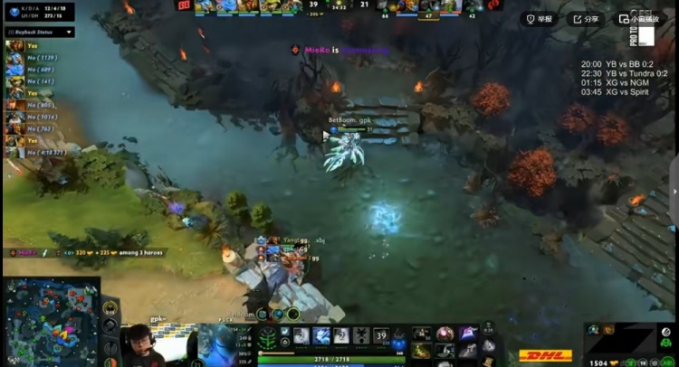 34分钟BB上路逮捕Ghost风行者,拆完YB上路高地!随后上路团战YB先秒kiritych拍拍,但是MieRo伐木机+gpk大鱼人2V5硬是连续强杀YB三人,MooN帕克交出买活留人,这波最终是YB打出3换4!稍微打回一点劣势!40分钟MooN帕克踩眼直接被BB五人开雾秒掉买活死!BB再拆YB中路高地!回头继续拿下肉山!kiritych拍拍继续带盾!