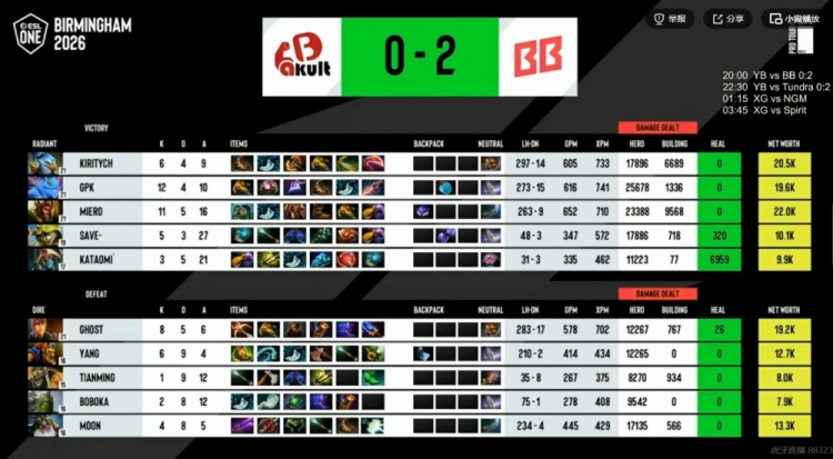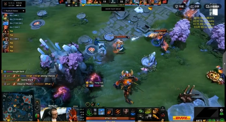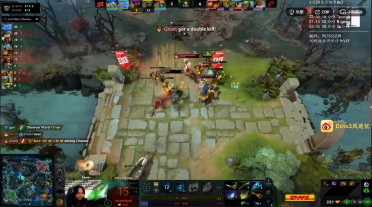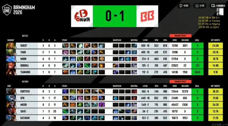 46分钟高地团Ghost风行者吃到大晕被直接贴脸强杀,kiritych拍拍BKB再贴脸留住Yang孽主,BB拆完YB三路高地!49分钟BB卷土重来,kiritych拍拍跳脸先后单切Yang孽主+MooN帕克,侧翼gpk大鱼人配合队友击杀Ghost风行者!BB赢下第一局!