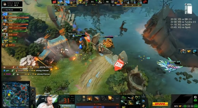 中期BB借助大鱼人和伐木机强势期开始扫图,将经济差扩大到一万以上!25分MooN帕克下路收线直接跳脸拍拍熊被kiritych三巴掌拍死!29分钟中路团BB打出1换2之后持续追击,MieRo伐木机配合队友找到了Ghost风行者将他强杀!这波BB最终扩大战果打出1换4,回头再拿魔晶和肉山!2万经济差了!kiritych拍拍继续带盾!