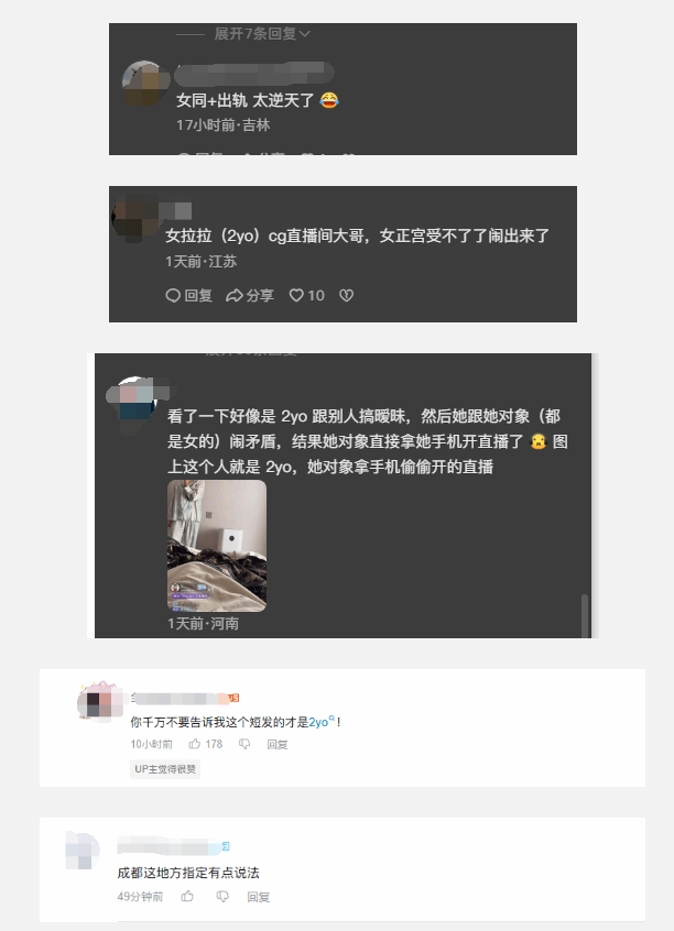 据了解,2yo的同性伴侣近日用2yo的抖音账号开播,躺在床上当面质问2yo出轨相关问题,称其与别人暧昧、删除聊天记录,并指这是第四次出轨。“正宫女”表示,开直播就是为了“跟她爆了”鱼死网破。