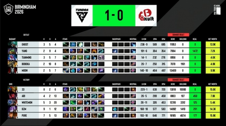 25分钟,Tundra不等下一个肉山,直接上路上高,33蝙蝠烧火上去都没人能处理,YB被Tundra三核入场清洗,全员阵亡后打出GG,Tundra赢下第一局。