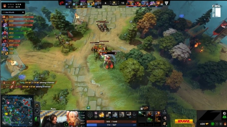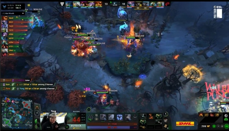 开局Tundra上下路同时开花拿下头2血,线上猖狂到冲塔杀人,就算有boboka琼英碧灵游走支援,协助Moon小小击杀bzm紫猫,再对线期后,双方经济还是没有拉开差距,尤其是pure影魔经济仍然领跑。