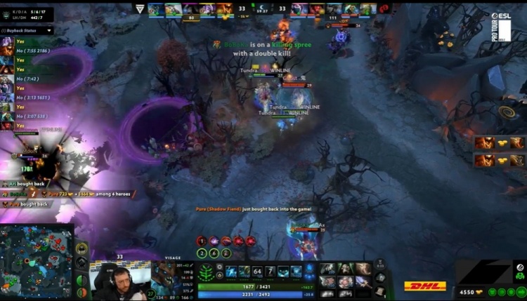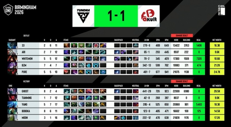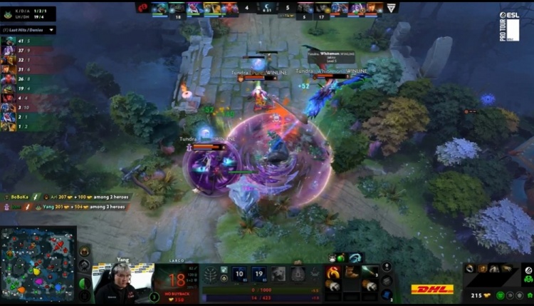 54分钟,Tundra下路进攻,Moon小小投掷人回去,yang剃刀却回不去,YB交出2个买活才逼退Tundra。Tundra回头捉带线圣堂,天命暗影恶魔关和boboka琼英碧灵沉默一枪将残血圣堂救了回来,还反杀了pure影魔,又将局势拖住。59分钟,双方再度爆发团战,这次入场的海民没能动到圣堂,琼英碧灵BKB又打控制又打输出,生生将影魔击杀,影魔交买活过来要打,YB撤退回高地,Tundra回头控肉山。圣堂的圣剑加华冠,赌的就是一下的击杀和队友的保护。