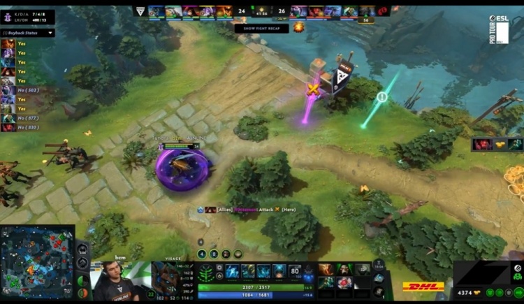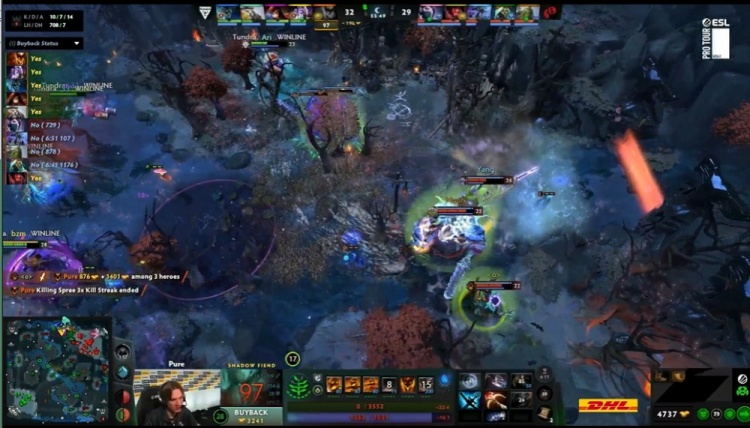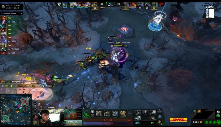 46分钟,双方三角区遭遇,天命暗影恶魔保护Ghost圣堂被pure影魔找到2下击杀,Moon小小将影魔丢进了队友人群中,影魔倒地的同时让全员残血,圣堂被bzm紫猫追过来击杀,为了保住高地,YB交出了几乎全部买活,局势又一次被Tundra逆转成功。