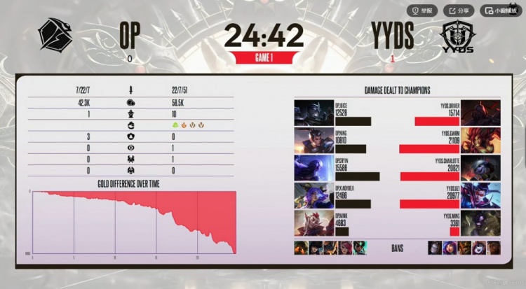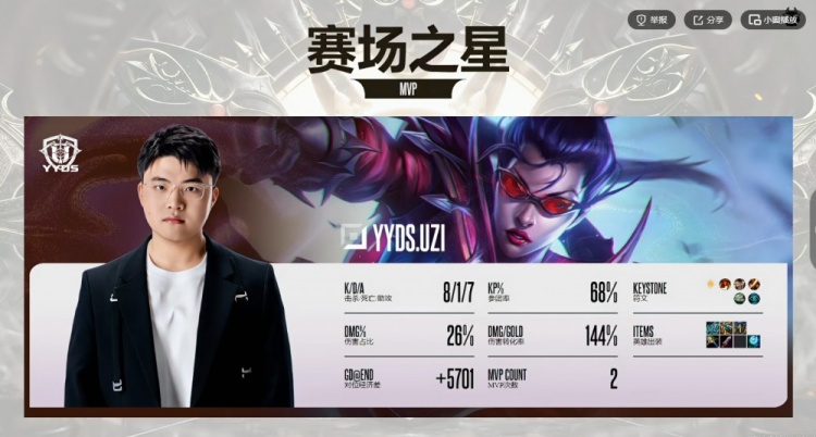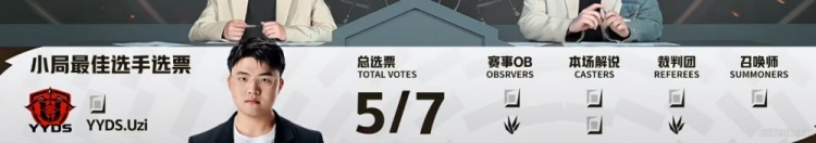 首局比赛BP端YYDS将小炮摇到中单管住Cryin瑞兹,gwrm婕拉两次变奏gank帮助下路打出优势!Uzi选出的招牌薇恩前期几波gank收头加推塔,仅仅13分钟就对位压制了xiaoyueji芸阿娜三千块!中期团战Uzi薇恩一波勾引配合队友团灭OP之后收下大龙拉开一万多经济差!虽然Uzi薇恩送给Ning赵信一千块但无伤大雅,高地团Uzi薇恩依靠闪现完成拉扯,YYDS打出1换3之后结束掉首局比赛,先拿一分!