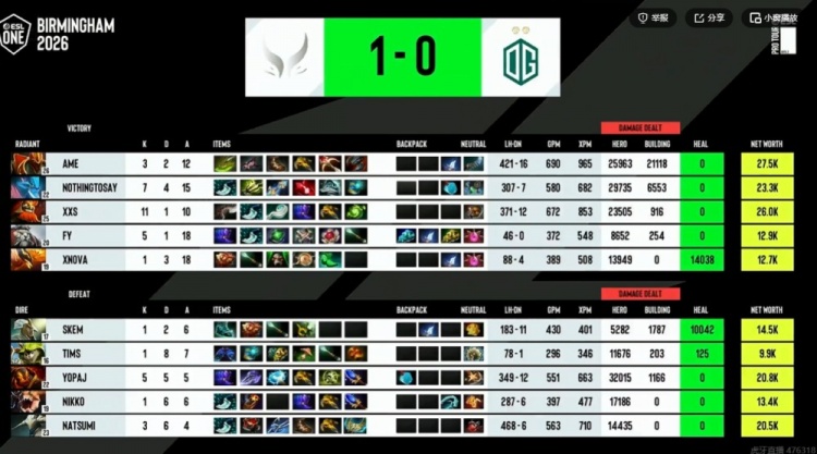 35分钟下路团,XG双酱油被强切双双交出买活,NTS老鹿吃满伤害和Natsumi斯温互换,残局Nikko獣被留,XG拆掉对手中下两路高地之后逼出塔防撤退!40分钟XG逮捕小松鼠之后站上高地,OG正面完全打不动Ame龙骑啊!Nikko獣被击杀之后交出买活,Fy海民先手出击勾引给到了Xxs玛尔斯矛大三个的机会!OG被逐个击破之后敲出GG!XG先拿一分!