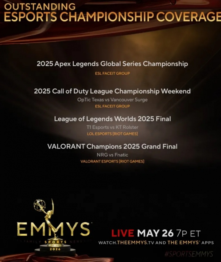 直播吧3月26日讯 第47届体育艾美奖杰出电竞赛事报道奖提名名单公布:S15决赛、巴黎全球冠军赛决赛等入围,结果将于5月26日公布。