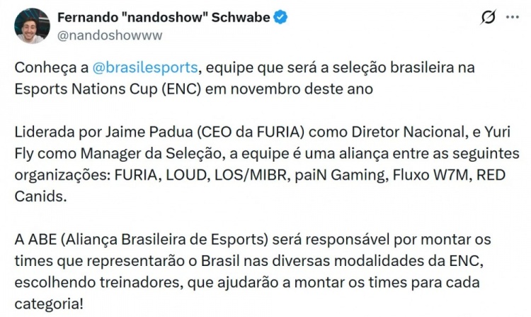 巴西电子竞技联盟将负责组建代表巴西参加ENC各项赛事的队伍,并挑选教练协助组建各组别的队伍。"
