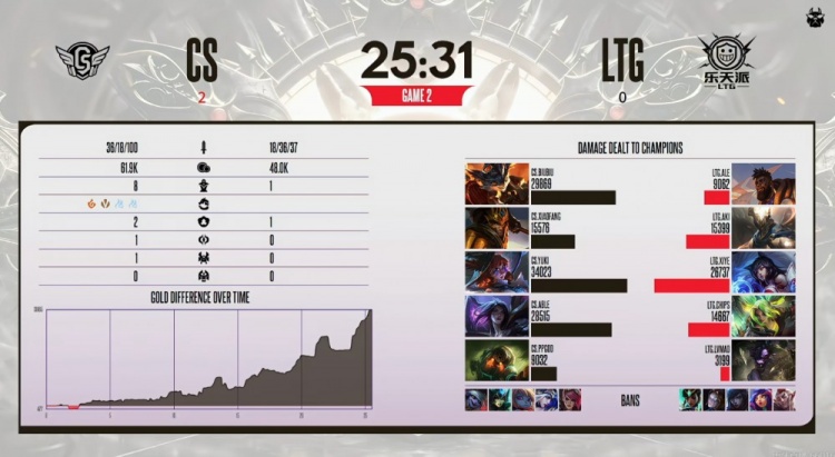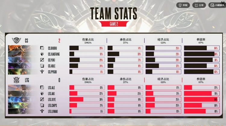 第二局比赛LTG中野gank连续击杀yuki阿萝拉,不过下路Able卡莎预判虚空索敌拿到线杀!7分钟chips泽丽下路Q空W空+反向Q结果被Able卡莎对位单杀!