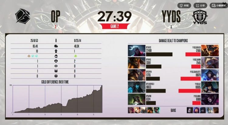 第二局比赛xiaoyueji卡莉斯塔拿下一血之后给足压力,配合Ning皇子gank连续越塔击杀YYDS下路组!Uzi的女警早早陷入大劣势!Ning皇子的活跃也让Cryin卡牌对线毫无压力!中期OP持续扩大优势!虽然YYDS下路一波多打少让Uzi女警拿到一千块赏金,但随即Ning皇子中路盖大,OP一波团灭对手直接拉开快一万经济差没了悬念!最终OP拿下大龙之后下路团战再度团灭YYDS结束比赛,将比分扳平为1-1!