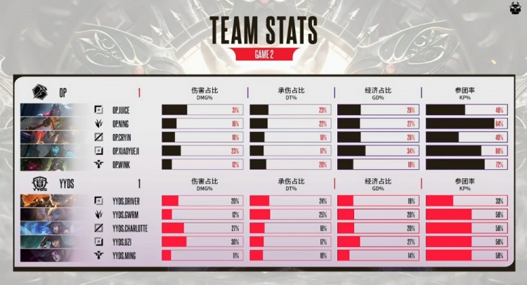 OP:上单Juice,打野Ning,中路Cryin,下路xiaoyueji,辅助Wink