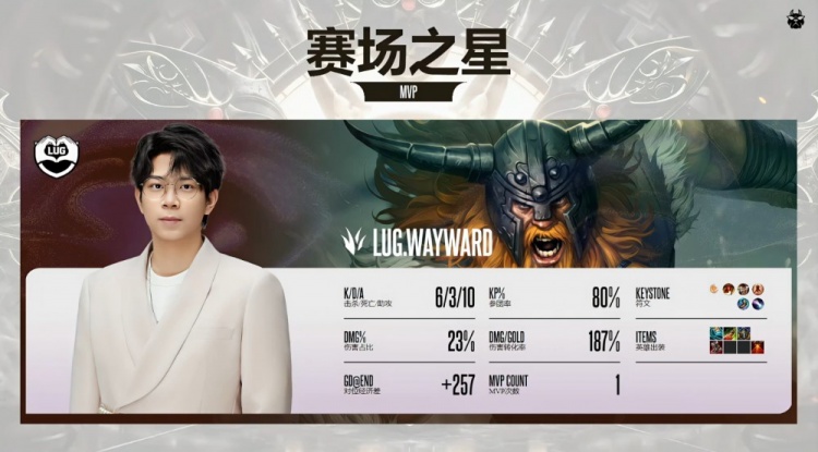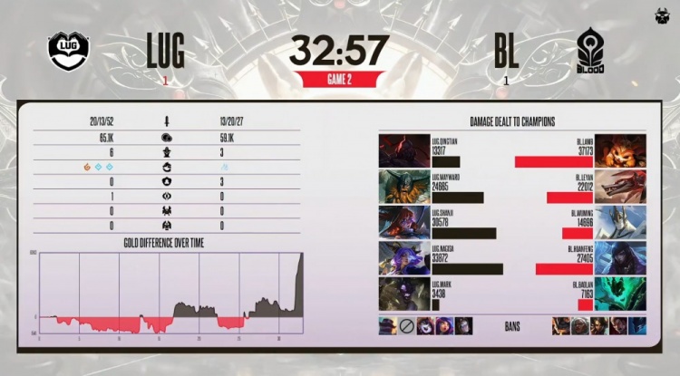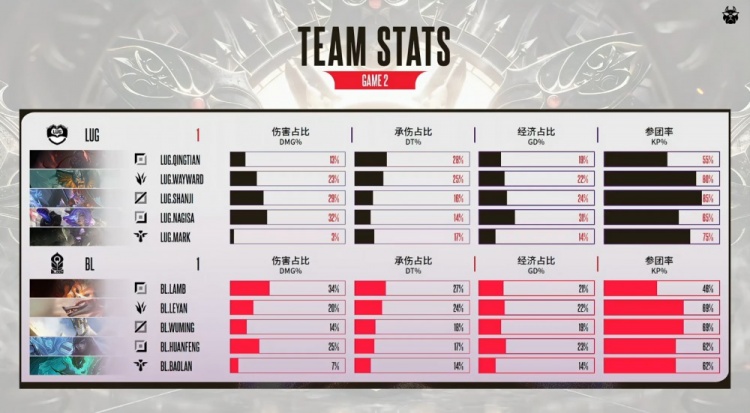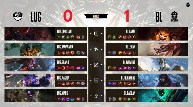 后期小龙团,黄神奥拉夫狂砍,shanji阿萝拉再轰三杀,黄神队打出3换4听牌电龙魂。黄神奥拉夫长驱直入宝蓝队高地前砍掉huanfeng后自己被换。龙魂团,黄神奥拉夫进场砍掉huanfeng,LUG打出0换5团灭宝蓝队后,一波推平基地扳回一城。