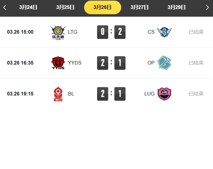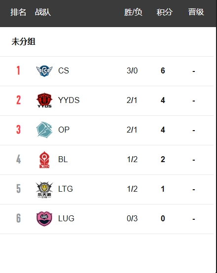 直播吧3月26日讯 今日Uzi杯小组赛第四日的比赛已经全部结束,CS战队击败TLG延续自己的不败战绩,YYDS以2-1的比分击败OP拒绝连败,LUG以1-2的比分不敌BL遭遇连败!