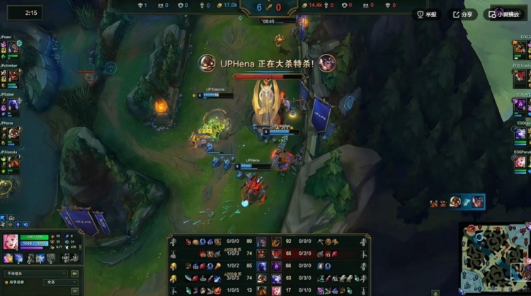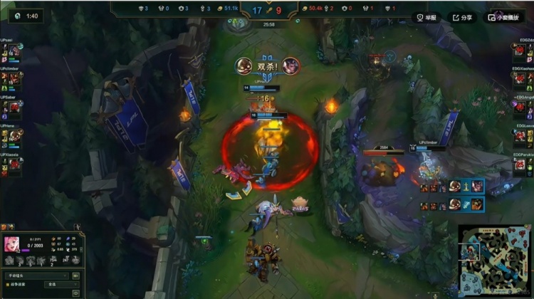 8分钟UP下路多打少持续减员EDG,EDG想反打但是葫芦娃送爷爷了啊!这波UP最终越塔强杀xiaohao赵信,又打出一波0换3!领先优势快3K了!