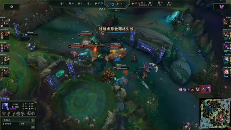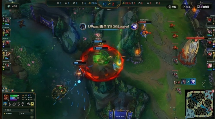16分钟UP就拿下听牌龙给到压力,22分钟龙魂团,UP第一波想拉扯EDG上野双大,但是xiaoxia泰坦出钩白给了啊!Angel马尔扎哈进场配合队友打出0换4啊!Angel马尔扎哈四杀啊!EDG拿下关键小龙+大龙!抹平前期经济差!