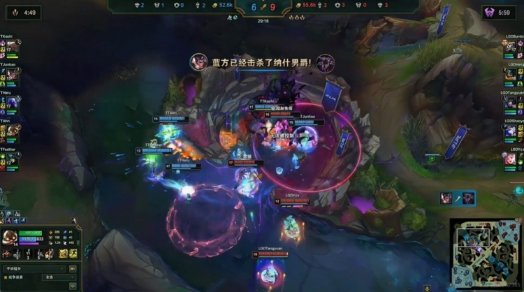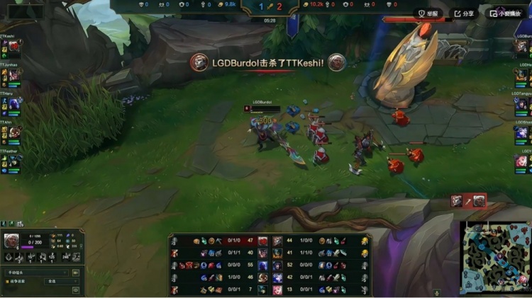 28分钟LGD连续拿下三条土龙率先听牌,TT大龙逼团Heng奥拉夫抢龙失败,Burdol亚恒从上面进场没能打出被动买一送一了!残局TT先后留住对手双C,最终打出0换4,直接拆掉LGD两座中路外塔!TT反超3K经济了!