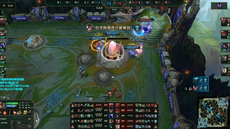 31分钟高地团TT打出Burdol亚恒被动,拆掉中路高地之后撤退!随后TT拿下第六条小龙!随后中路团Keshi安蓓萨直接大招命中Shaoye艾希,自己换掉了LGD的下路双人组!没人管的Ahn库奇输出拉满!TT打出1换4之后可以结束比赛,先拿一分!