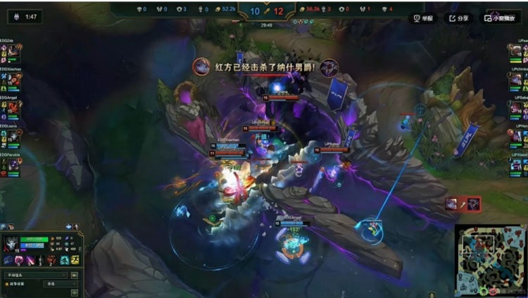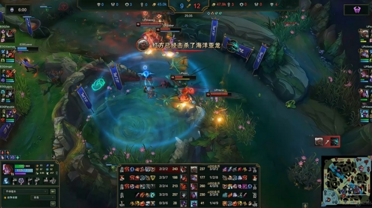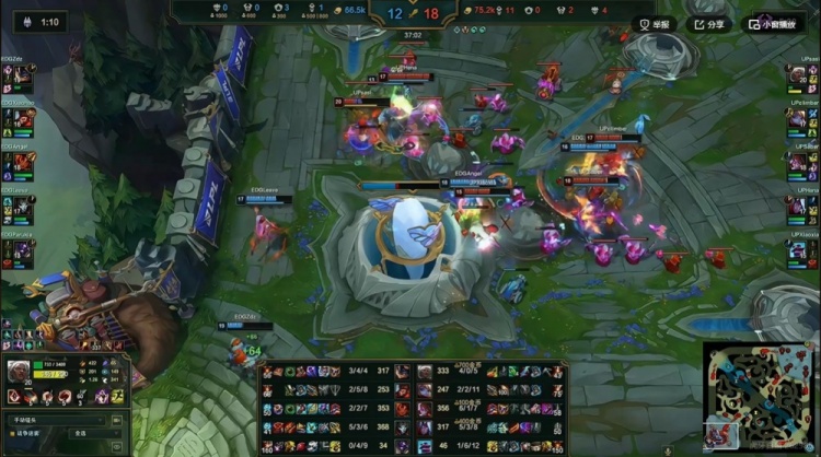 29分钟UP下野偷掉大龙!Xiaohao猴子进场被波比锤飞啊!残局sasi安蓓萨黏住了Zdz兰博!UP打出0换2,拆掉了EDG的中路二塔+高地!经济差距来到快6K了!