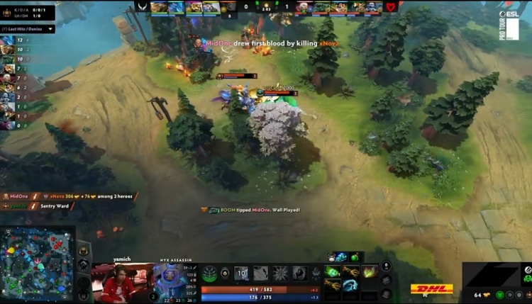 2分钟,下路BOOM潮汐带队弄xNova戴泽,戴泽残血走位躲天火却没想到还是被天火击杀,卡尔获得一血。