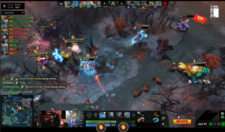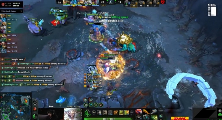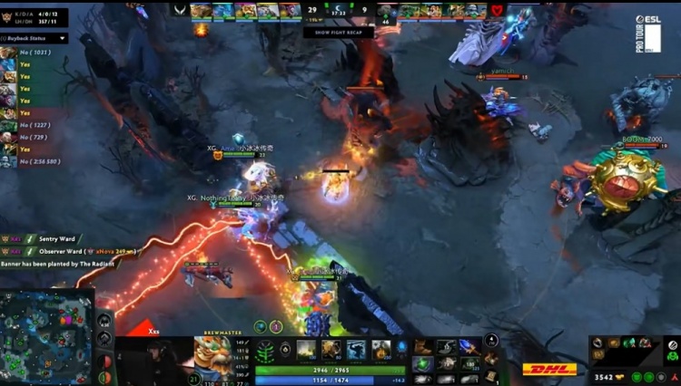24分钟,Mouz过河道捉XG辅助,xNova戴泽被击杀,Ame大圣和NTS拉席克支援过来,xxs酒仙开大招留Crystallis冥魂大帝,冥魂大帝想要跳走被拉席克追上留下,XG进一步扩大经济优势。