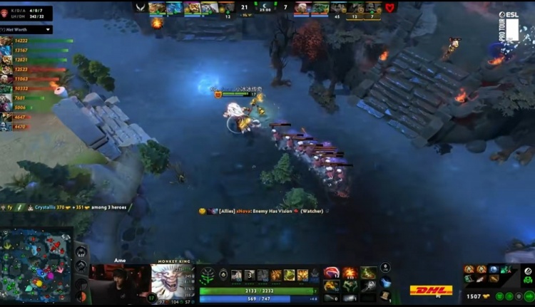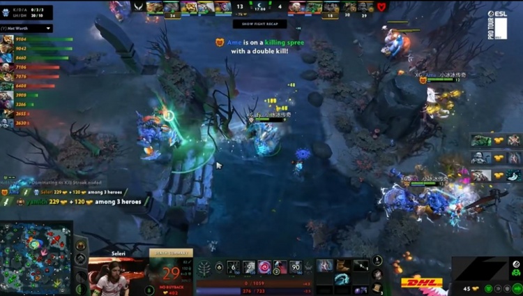 17分钟,Ame大圣带队动手冥魂大帝,XXS酒仙开大想留一命,大圣猴阵再杀一命,冥魂大帝倒地,双辅助一个被大圣追击,一个吃了xNova戴泽的毒都没有跑掉,XG将Mouz打三人阵亡,经济领先7K。