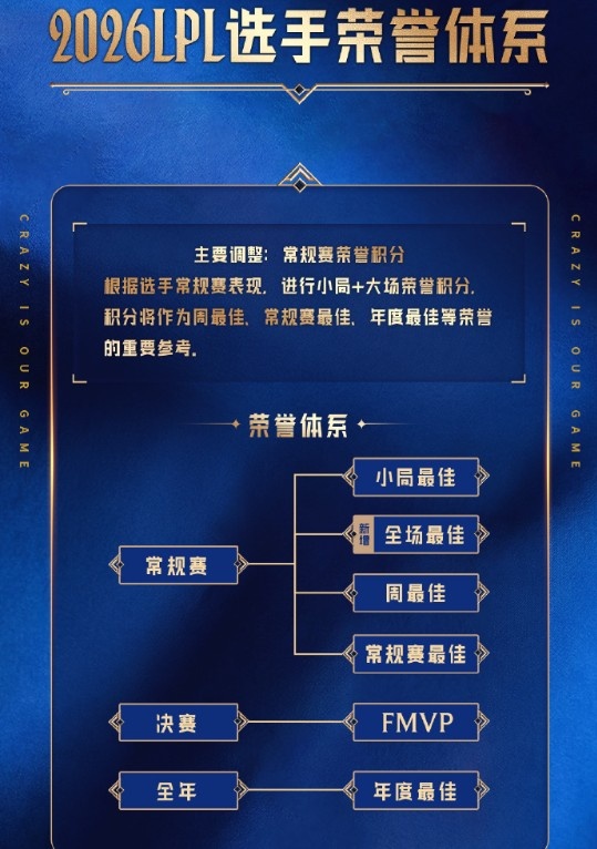 2026LPL选手荣誉体系周最佳荣誉评选规则也将进行调整,没有MVP积分的选手也可以参与周奖项评选。